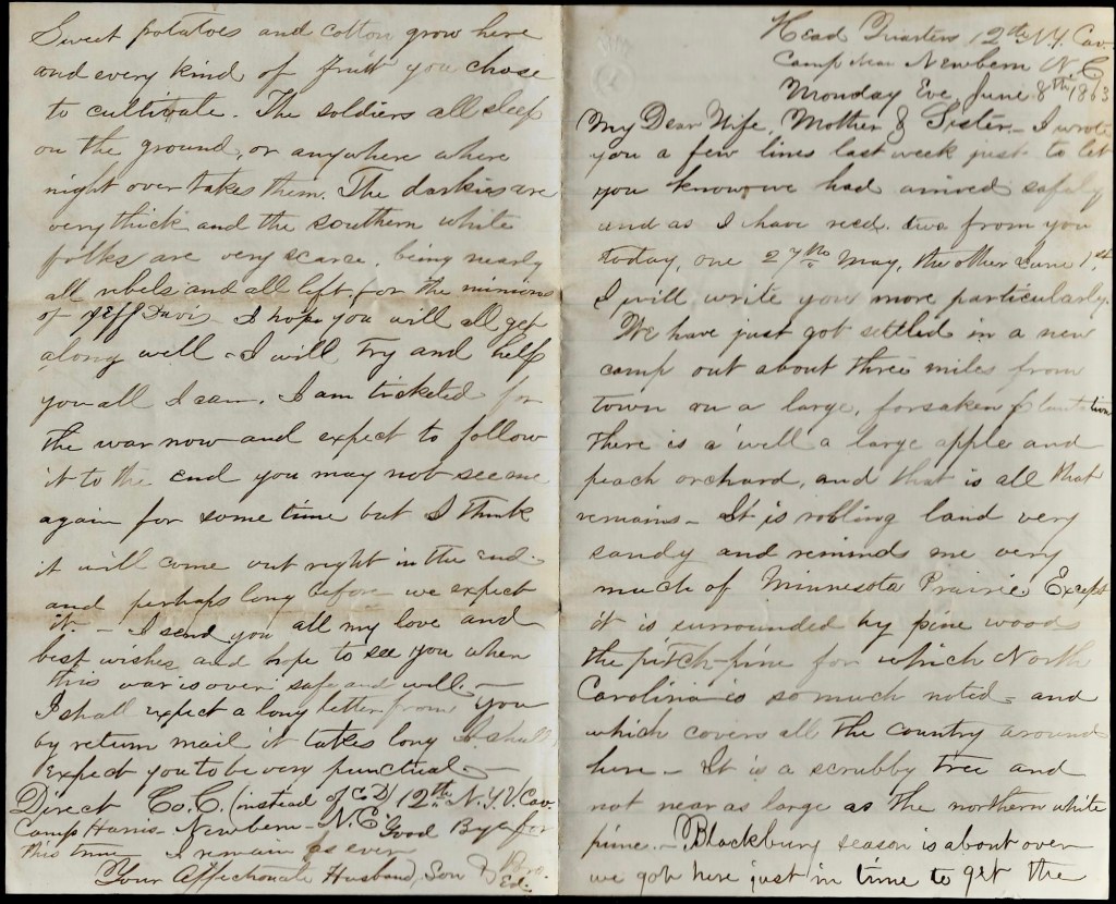 We have just got settled in a new camp out about three miles from town in a large forsaken plantation. There is a well, a large apple and peach orchard, and that is all that remains. It is rolling land, very sandy, and reminds me very much of Minnesota Prairie except is is surrounded by pine woods—the pitch pine for which North Carolina is so much noted—and which covers all the country around here. It is a scrubby tree and not near as large as the northern white pines. Blackberry season is about over. We got here just in time to get the last of it. I tell you it seems very strange to be picking blackberries the first of June and to see peaches and apples half grown and corn as high as your head and new potatoes. This is a great country for fruit and I think a fine country to live in. I think I should like to live here if it was filled with northern people.