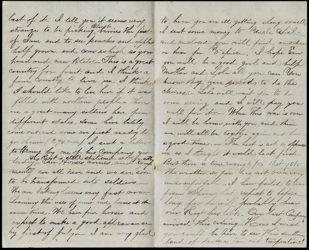 Our horses, arms and equipments are all here and we are soon to be transformed into soldiers. We are taking lessons very fast now, learning the uses or arms and horses at the same time. We have fine horses and expect to make a good appearance by first of July. I am very glad to hear you are all getting along so well. I sent some money to Uncle Abel and enclosed you will find an order on him for 5 apiece. I hope Em, you will be a good girl and help Mother and Lola all you can. You know they have nobody to do the chores. Lola will want you to do some sewing and I will pay you well for it. When this war is over, I will be home with you and then we will all be together again and have a good time.