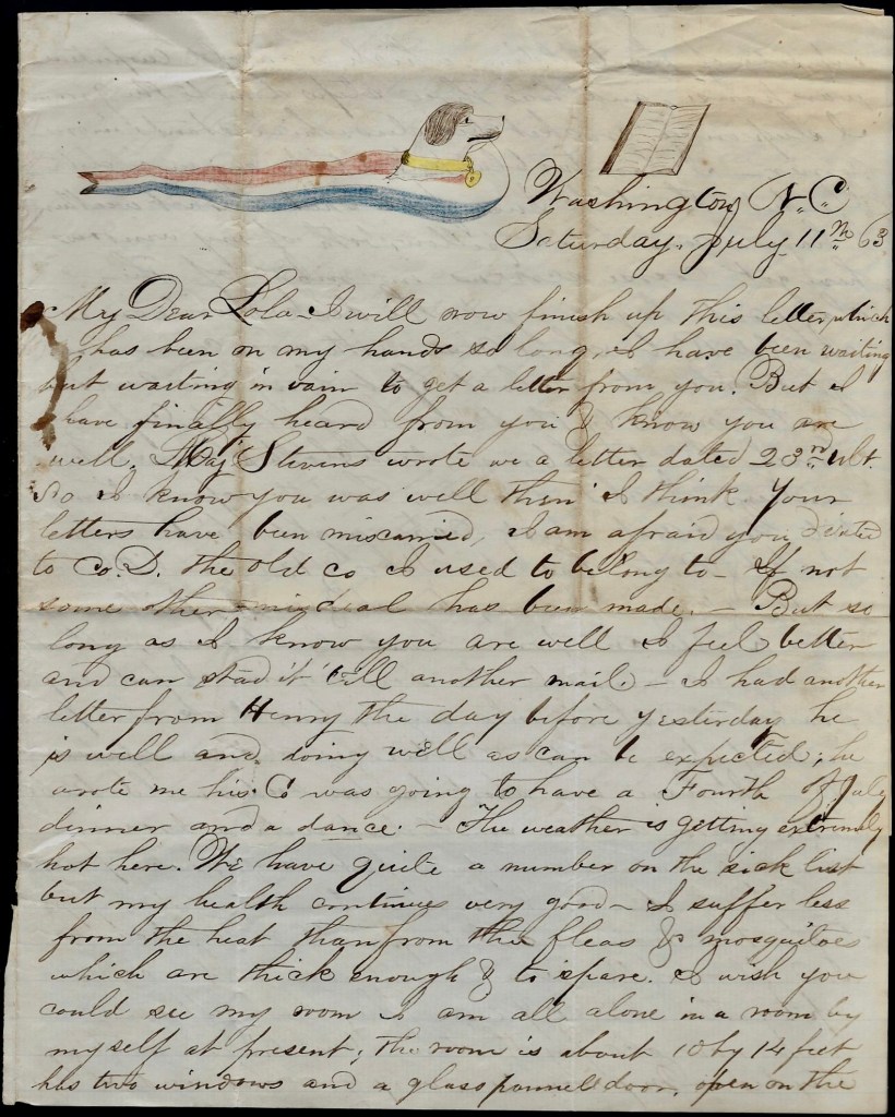 I will now finish up this letter which has been on my hands so long. I have been waiting but waiting in vain to get a letter from you. But I have finally heard from you I know you are well. Maj. Stevens wrote me a letter dated 23rd ult. so I know you was well then. I think your letters have been miscarried. I am afraid you directed to Co. D, the old company I used to belong to. If not, some other misdeal has been made. I had a nother letter from Henry the day before yesterday. He is well and doing well as can be expected. He wrote me his company was going to have a Fourth of July dinner and a dance. The weather is getting extremely hot here. We have quite a number on the sick list but my health continues very good. I suffer less from the heat than from the fleas & mosquitoes which are thick enough to spare.