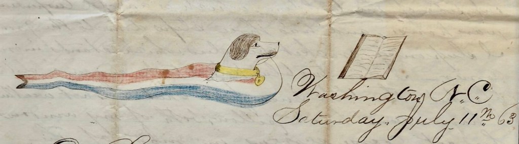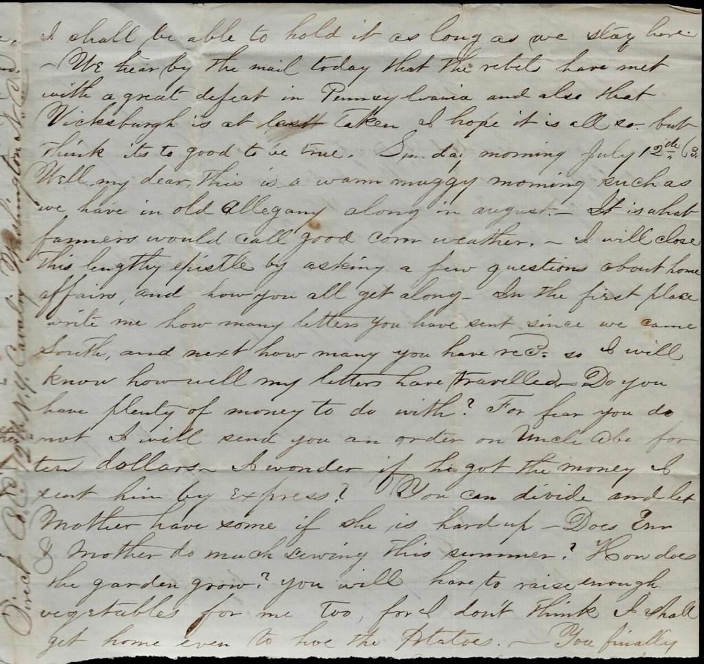 Sunday morning, July 12th, ’63. Well, my dear, this is a warm, muggy morning such as we have in old Allegany along in August. It is what farmers would call good corn weather. I will close this lengthy epistle by asking a few questions about home affairs, and how you all get along. In the first place, write me how many letters you have sent since we came South, and next how many letters you have received so I will know how well my letters have travelled. Do you have plenty of money to do with? For fear you do not, I will send you an order on Uncle Abe for ten dollars. I wonder if he got the money I sent him by Express? You can divide and let Mother have some if she is hard up. Does Em & Mother do much sewing this summer? How does the garden grow? You will have to raise enough vegetables for me too, for I don’t think I shall get home even to hoe the potatoes. You finally got cheated out of a Melodeon but it will sound all the better when I get home to hear it and we have a good sing.