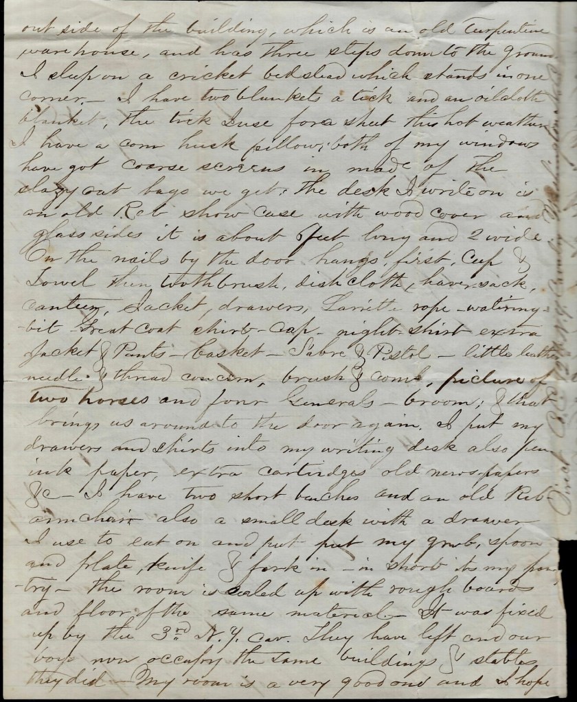I wish you could see my room. I am all alone in a room by myself at present; the room is about 10 by 14 feet, has two windows, and a glass panel door, open on the outside of the building, which is an old turpentine warehouse and has three steps down to the ground. I sleep on a cricket bedstead which stands in one corner. I have two blankets, a tick, and an old oil cloth blanket. The tick I use for a sheet this hot weather. I have a corn husk pillow; both of my windows have got course screens in made of slazy oat bags we get. The desk I write on is an old reb show case with wood cover and glass sides. It is about 6 feet long and two wide. On the nails by the door hangs first, cup and towel, then toothbrush, haversack, canteen, jacket, drawers, lariat rope, watering bit, great coat, shirt, cap, night shirt, extra jacket & pants, basket, sabre & pistol, little leather needle & thread concern, brush & comb, picture of two horses and four generals, broom, & that brings us around to the door again.