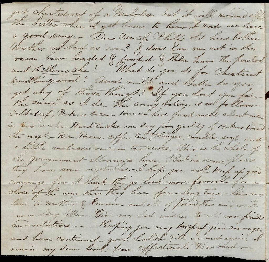 Does Uncle Philo’s old hens bother Mother as bad as ever? And does Em run out in the rain bare headed & footed & then have the paw-tode and beller-ache? What do you do for Chestnut kindling wood? And milk and butter—do you get any of those things? If you don’t, you fare the same as I do. The army ratio is as follows: salt-beef, pork or bacon. Here we have fresh meat about once in two weeks, Hard tacks one day, poor quality of Baker’s bread the next. Rice, beans, coffee, tea, sugar, vinegar, candles, soap, and a little molasses once in two weeks. This is the whole of the government allowance here. But in some places they have some vegetables.