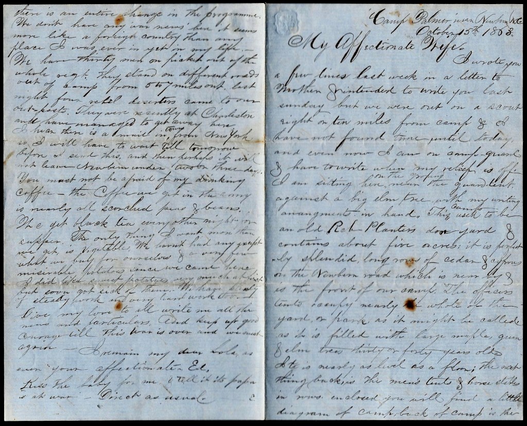 This large army is taking a rest & so I have a few spare moments today to write you of my continued good health and a few items of interest that have occurred since my last. I have returned from another trip to Newbern. The cars run now regularly once a day. I went down for some ammunition and other things for the company.