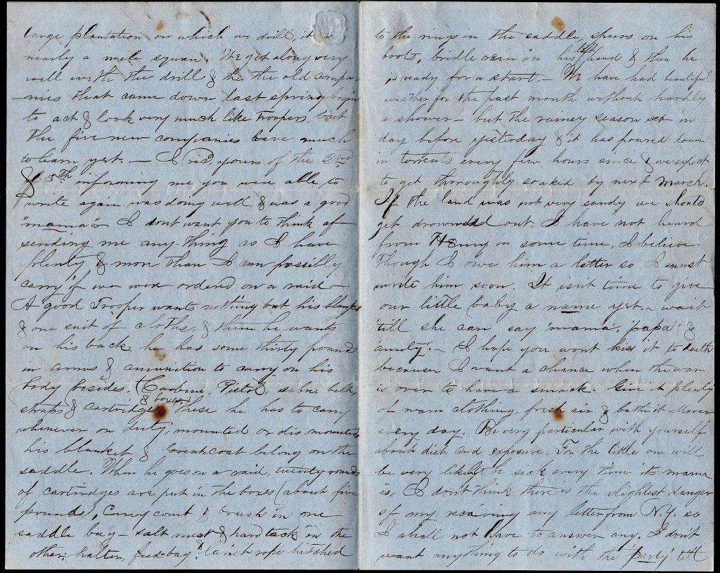 I received yours of the 2nd & 5th informing me you were able to write again, was doing well, & was a good “mama.” I don’t want you to think of sending me anything as I have plenty & more than I can possibly carry if we were ordered on a raid. A good trooper wants nothing but his blanket & one suit of clothes & them he wants on his back. He has some thirty pounds in arms & ammunition to carry on his body besdies (carbine, pistol, sabre, belt, straps, & cartridges & box) These he has to carry whenever on duty, mounted or dismounted. His blanket & greatcoat belong on the saddle. When he goes on a raid, twenty rounds of cartridges are put in the boxes (about five pounds), curry comb & brush in one saddle bag, salt meat & hard tack in the other; halter, feed bag & lariat rope hitched to the rings in the saddle, spurs on his boots, bridle rein in his left hand & then he is ready for a start.