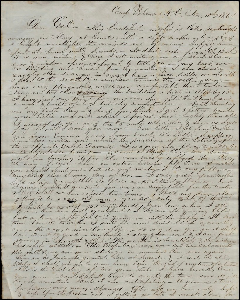 Well, my dear, I am getting to be a very old man—over 25! Only think of that! I shall be so old you will hardly know me when I get home. Then how bad you’ll feel? We are all growing old, but as long as the heart is young, we will be happy. The last time I wrote to Mother I sent for some dried berries & now they are on the way—a nice box of them. So my dear, you can see I shall have something good. My health is very good now & I am fast gaining in strength & flesh. The weather is beautiful & the sickness has nearly abated.