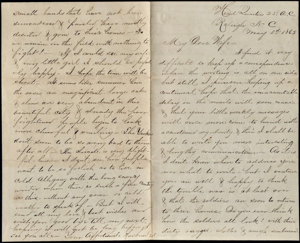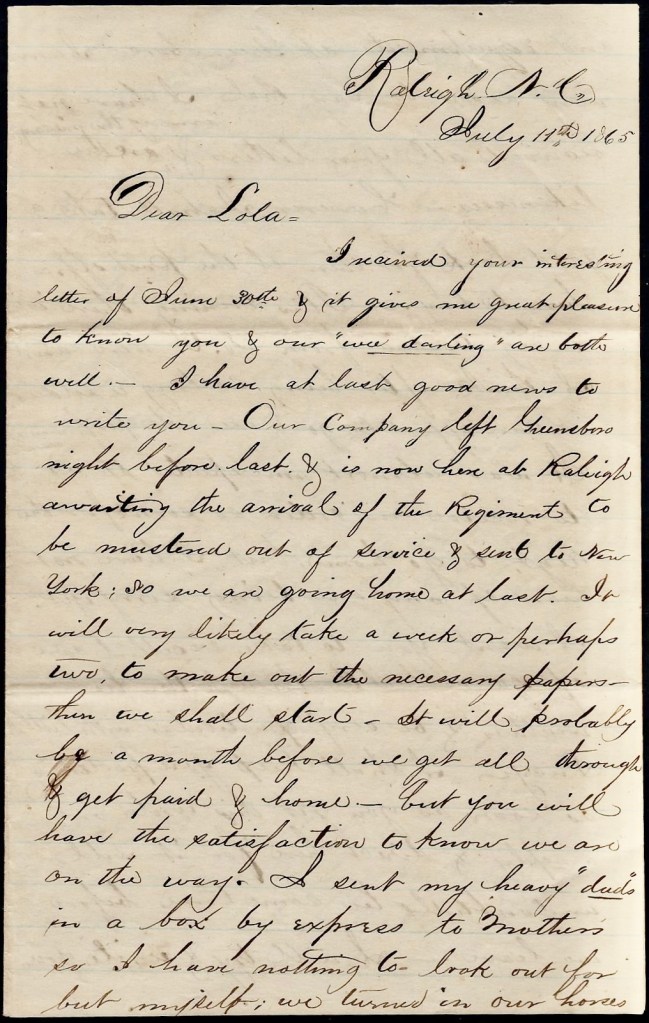 I received your interesting letter of June 30th & it gives me great pleasure to know you & our “wee darling” are both well. I have at last good news to write you. Our company left Greensboro night before last & is now at Raleigh awaiting the arrival of the regiment to be mustered out of service & sent to New York; so we are going home at last. It will very likely take a week or perhaps two to make out the necessary papers. Then we shall start. It will probably be a month before we get all through & get paid & home, but you will have the satisfaction to know we are on the way. I sent my heavy “duds” in a box by Express to Mother’s so I have nothing to look out for but myself. We turned in our horses and equipments at Greensboro. I am very sorry to say that I have not received all your letters & among the missing are the likenesses. However, I shall take a good look for them at the post office here today.