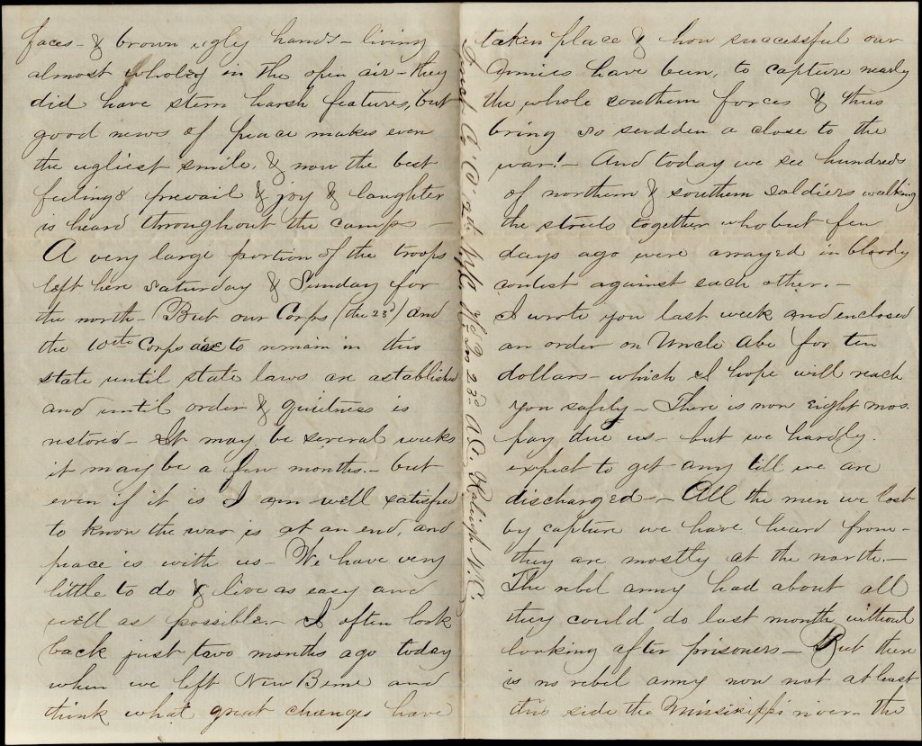 A very large portion of the troops left here Saturday & Sunday for the North. But our Corps (the 23rd) and the 10th Corps, are to remain in this state until state laws are established and until order & quietness is restored. It may be several weeks, it may be several months, but even if it is, I am well satisfied to know the war is at an end and peace is with us. We have very little to do & live as easy and well as possible. I often look back just two months ago today when we left New Berne and think what great changes have taken place & how successful our armies have been to capture nearly the whole southern forces & thus bring so sudden a close to the war! And today we see hundreds of northern & southern soldiers walking the streets together who but a few days ago were arrayed in bloody contest against each other.