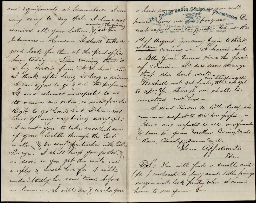 I haven’t had a letter from Emma since the first of June. It does seem strange that she don’t write. We shall not get paid nor discharged until we get to New York though we shall be mustered out here. I send kisses to little Lucy. She can now expect to see her papa. Give my respects to all our friends & love to your Mother, Connie, Mate, Rose, Charley, Sam &c. Your affectionate, — Ed