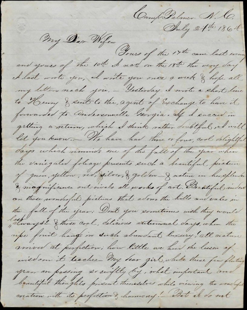 I hardly know how to commense this, it has been so long since I heard from you. But as I expect at least one letter from you in the next mail, which is expected to arrive today, I mean to commence this and finish it after I get a letter from you. I would like to have you see our camp as it now stands. All the tents are raised four feet high with small ground pine poles out up in the manner of a log house, only much nicer. I have room in my tent for a small table & many other things. The tent make a good roof for this “stockade” as we call the body of our houses. We have also built a roof to shelter our horses from rain and sun & now we are as comfortable as ever. We have had much rainy weather for the past two weeks & quite cool too. I have a good appetite and some enjoyment although I long for the expiration of my term of enlistment. I have long since give up the idea the war would close & now fully expect to serve my full period. Though it is hard to be so long absent from those we love, it is no more than many are obliged to do & so I live on in hopes that it may be my firtune to outlive this confinement and once more see the bright faces of my little family & have the gladness it always gives to meet those we love who have been long absent. And my dear wife, what happiness it will be to have your continual presence with those laughing & roguish eyes which I suppose have grown more sedate & womanly during the two years that have transformed you from the girl I loved so well to the woman, wife & monther in whom I place all my future love, hopes, & happiness. Yes, my dear wife, and our little girl, what would I give to see its bright face & share with you the care & responsibility of our little one. It is now some seven months old or nearly that & for the next few months will require much care & patience as it will be talking & have other difficulties all babies have to encounter. It will need great prudence & discretion on your part, my dear, to keep yourself and little one in health. But I have great confidence in you as I know you have learned many a useful lesson since our acquaintance first commenced & that you will do all in your power for the mutual health & happiness of our little family.