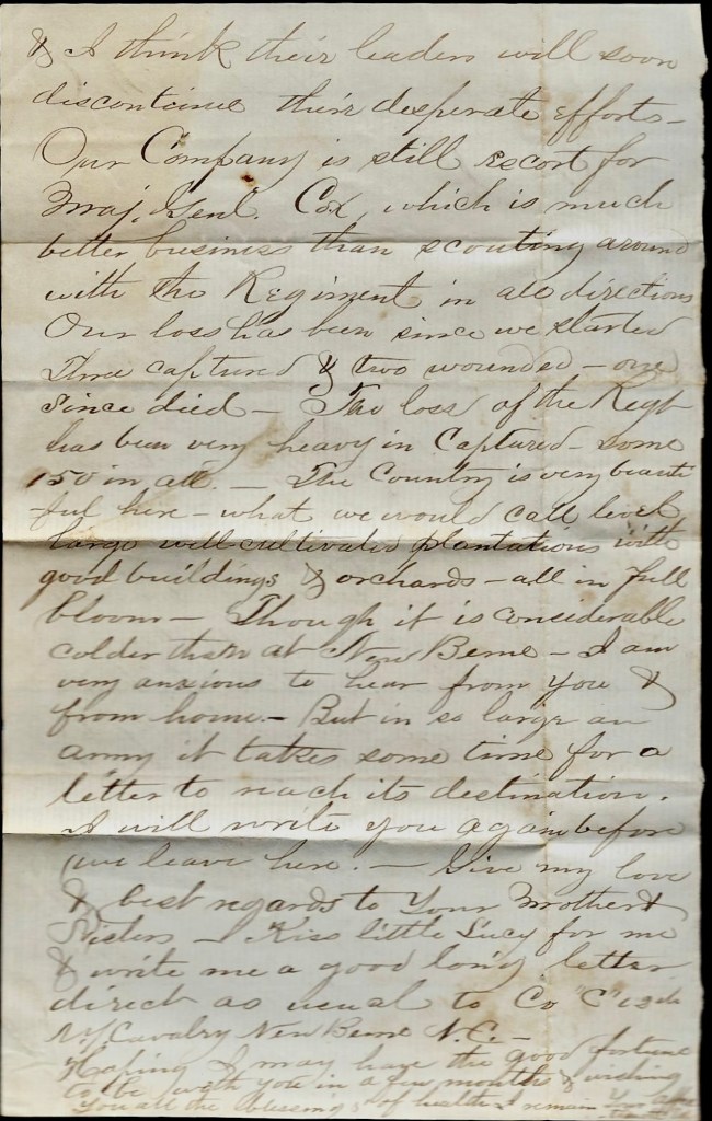 Our company is still escort for Maj. General Cox, which is much better business than scouting around with the regiment in all directions. Our loss has been since we started three captured & two wounded—once since died. The loss of the regiment has been very heavy in captured—some 150 in all. The country is very beautiful here—what we could call level, large well-cultivated plantations with good buildings & orchards, all in full bloom, though it is considerable colder than at Newbern.