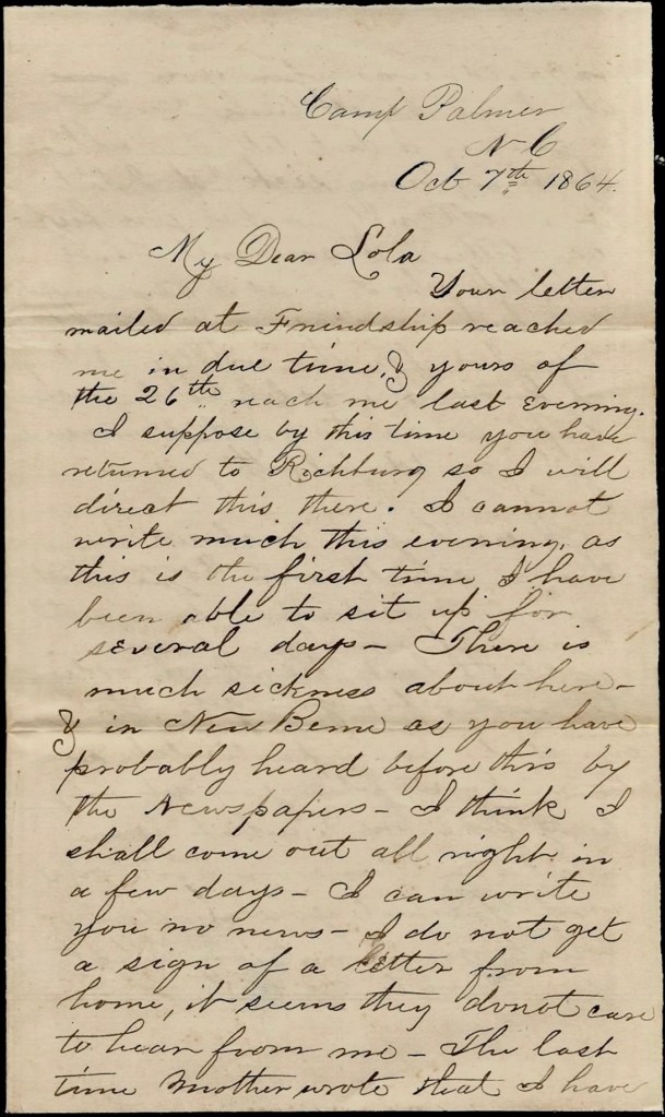 Your letter mailed at Friendship reached me in due tie & yours of the 26th reached me last evening. I suppose by this time you have returned to Richburg so I will direct this there. I cannot write much this evening as this is the first time I have been able to sit up for several days. There is much sickness about here & in New Bern as you have probably heard before this by the newspapers. I think I shall come out all right in a few days. I can write you no news. I do not get a sign of a letter from home. It seems they do not care to hear from me. The last time Mother wrote that I have received was when you were at home the 1st time.