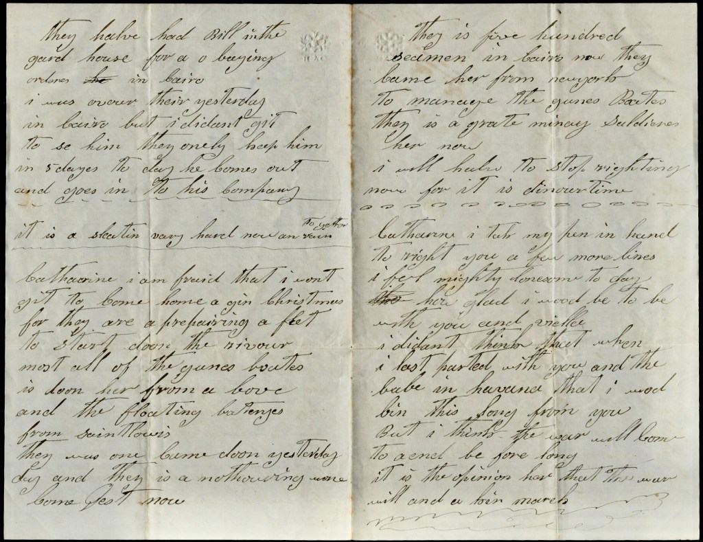 Catharine, I am afraid that I won’t get to home against Christmas for they are a preparing a fleet to start down the river. Most all of the gunboats is down here from above and the floating batteries from Saint Louis. There was one come down yesterday and there is another one come just now. There is five hundred seamen in Cairo now. They came here from New York to manage the gunboats. There is a great many soldiers here now. I will have to stop writing now for it is dinner time.