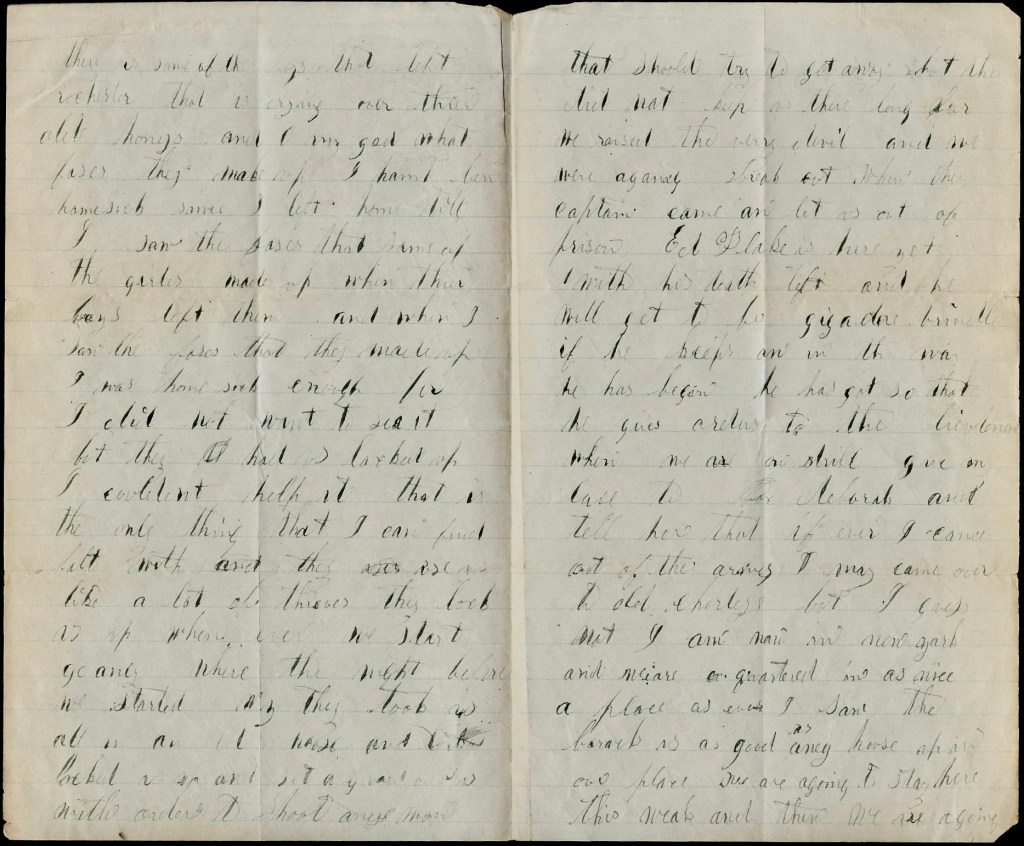 There is some of the boys that left Rochester that is crying over their old homes and O my God, what faces they make up. I hain’t been homesick since I left home till I saw the faces that some of the girls made up when their boys left them and when I saw the faces that they made up I was homesick enough for I did not want to see it but they had us locked up. I couldn’t help it. That is the only that I can find fault with and they use us like a lot of thieves. The lock us up whenever we start to go anywhere. The night before we started to New York they took us all in an old house and locked us up and set a guard on us with orders to shoot any man that should try to get away but they did not keep us there long for we raised the very devil and we were a going to break out when the Captain came and let us out of prison.