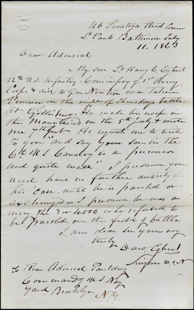The following brief letter was written by Daniel Egbert, Surgeon, USN, to Rear Admiral Hiram Paulding respecting the capture of his son, Lt. Tattnall Paulding (1840-1907) during the Gettysburg Campaign and spent time in Libby Prison. [See—1863: Tattnall Paulding to Hiram Paulding].