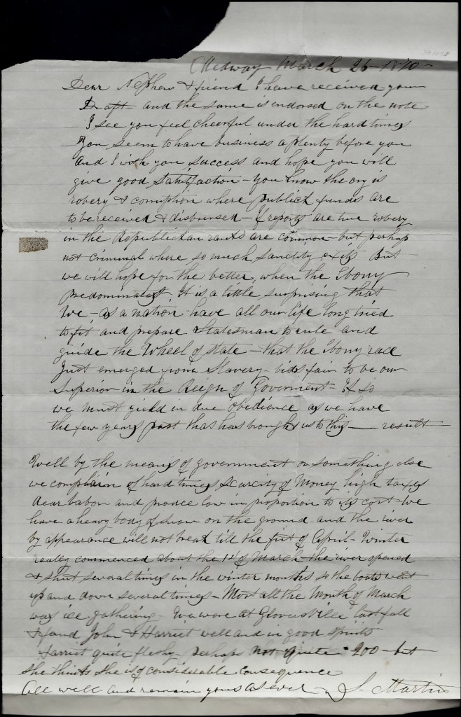 The identity of the author of this letter—whether male or female—could not be confirmed. It was datelined from Medway, Massachusetts, in late March 1870. There is no envelope with the letter to identify the addressee who we learn is the author’s “nephew and friend” and the benefactor of a note endorsed by the author. While completing this transaction, the author refers to the “radical Republican” corruption in the post-Civil War South and shares the belief that the “Ebony race” may prove better suited to govern than the Caucasian race.