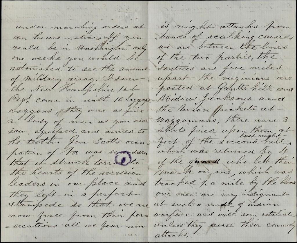 The Federal troops are in Virginia in that part that once was the district which makes them about four miles from us and even their shadow at that distance is some protection but not enough to make us entirely free from alarm. A move is soon to be made—where and when is not known—as a large number of troops are under marching orders at an hour’s notice. If you could be in Washington only one week, you would be astonished to see the amount of military array. I saw the New Hampshire 1st Regiment come in with 16 baggage wagons. They were as fine a body of men as you ever saw, equipped and armed to the teeth. Gen. Scott’s occupation of Virginia was so sudden that it struck terror to the hearts of the secession leaders in our place and they left in a perfect stampede so that we are now free from their persecutions. All we fear now is night attacks from bands of skulling cowards. We are between the lines of the two parties, The entries are five miles apart. The Virginians are posted at Gantt’s Hill and Widow Jackson’s, and the Union pickets at Waggaman’s. There were three shots fired upon them at the foot of the second hill last night which was returned by four of the guard who left their mark on one, which was tracked half a mile by the blood. Our men are very indignant at such a mode of indian warfare and will soon retaliate unless they cease their cowardly attacks.