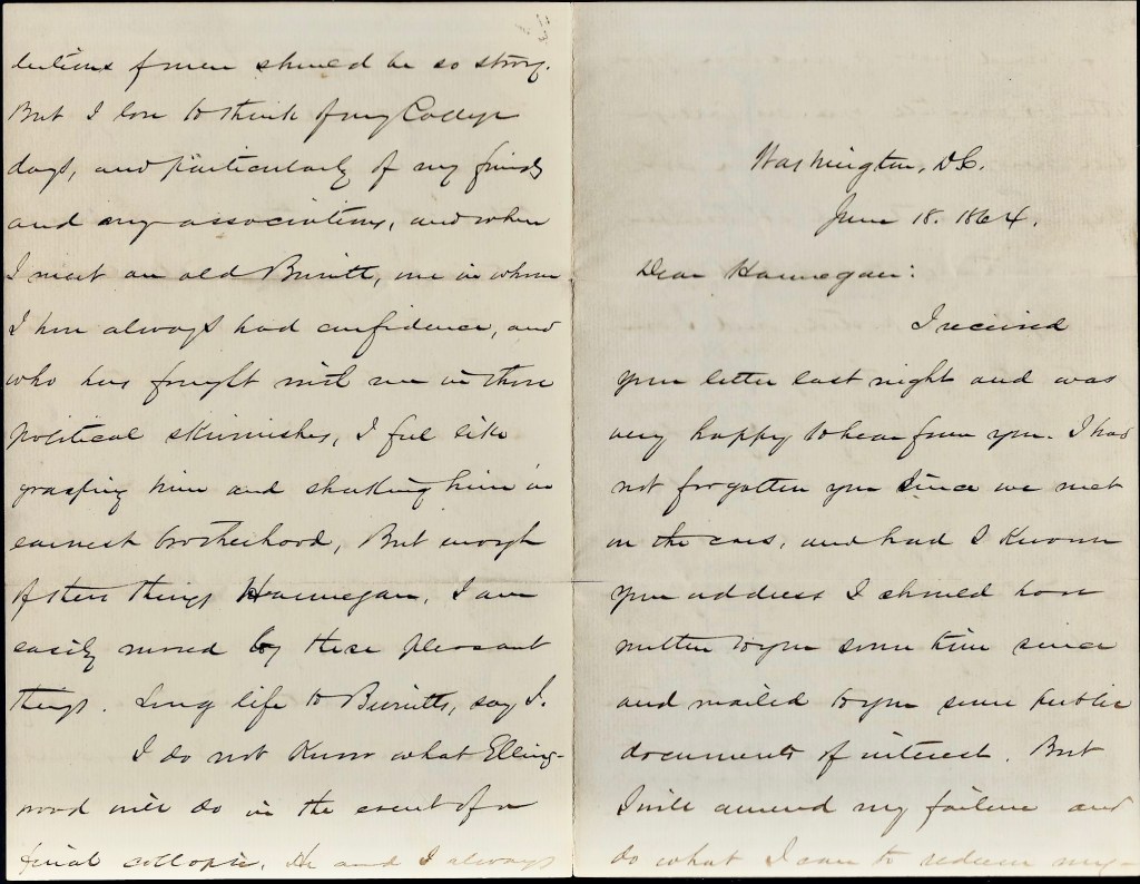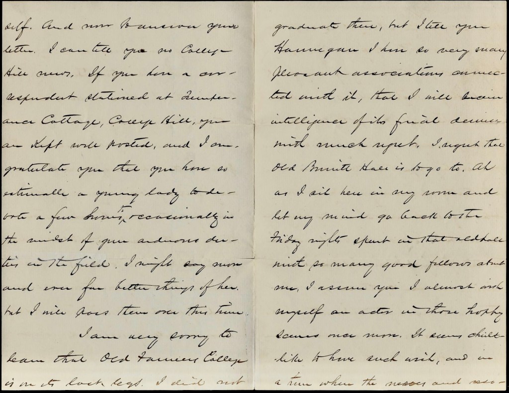 I am very sorry to learn that Old Farmer’s College is on its last legs. I did not graduate there, but I tell you, Hannegan, I have so very many pleasant associations connected with it that I will receive intelligence of its final demise with much regret. I regret that Old B___tt Hall is to go to. Oh, as I sit here in my rom and let my mind go back to the Friday nights spent in that old hall with so many good fellows about me, I assure you I almost wish myself an actor in those happy scenes once more. It seems child-like to have such a wish, and in a time when the news and resolutions of men should be so strong. But I love to think of my College days and particularly of my friends and my associations, and when I meet an Old Bu__tt, one in whom I have always had confidence, and who has fought with me in those political skirmishes, I feel like grasping him and shaking him in earnest brotherhood. But enough of these things. Hennegan, I am easily moved by these pleasant things. Long life to Bunitts, say I.