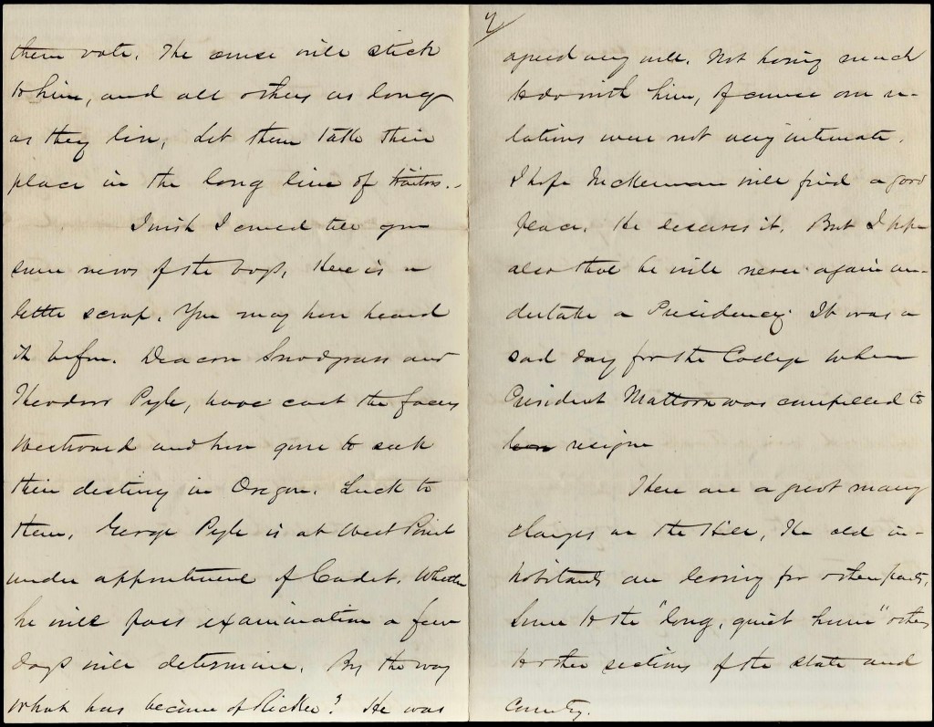 I wish I could tell you some news of the boys. Here is a little scrap. You may have heard it before. Deacon [W. J. ] Snodgrass and Theodore [W.] Pyle have [ ] and have gone to seek their destiny in Oregon. Luck to them. George [W.] Pyle 5 is at West Point under appointment of Cadet. Whether he will pass examination a few days will determine. By the way, what has become of Ricker? He was a good fellow. I always liked him, but he was so over sensitive that a little negligence on my part has severed our friendship—a thing I regret because the cause was so slight. If you correspond with him, give him my best regards and tell him I remember him still. If I knew where he was, I would write to him.