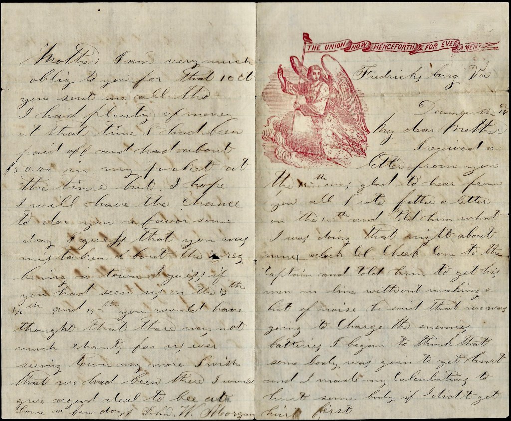 John wrote the letter to his mother who I believe was Nancy (Larimore) Newham (1813-1891)—married to her second husband, Thomas Newham (1816-1898), about 1849. It was written from the regiment’s encampment near Falmouth just after the Battle of Fredericksburg in which they were present but held in reserve and never called upon to engage with the enemy. The regiment was brigaded with the 76th and 95th New York, and the 56th Pennsylvania in Col. Gavin’s 2nd Brigade of Abner Doubleday’s 1st Division, 1st Corps. Morgan’s letter tells of the nighttime retreat across the Rappahannock and alleges that whiskey was being offered to the men in the event they were called upon to charge the enemy’s breastworks or batteries.