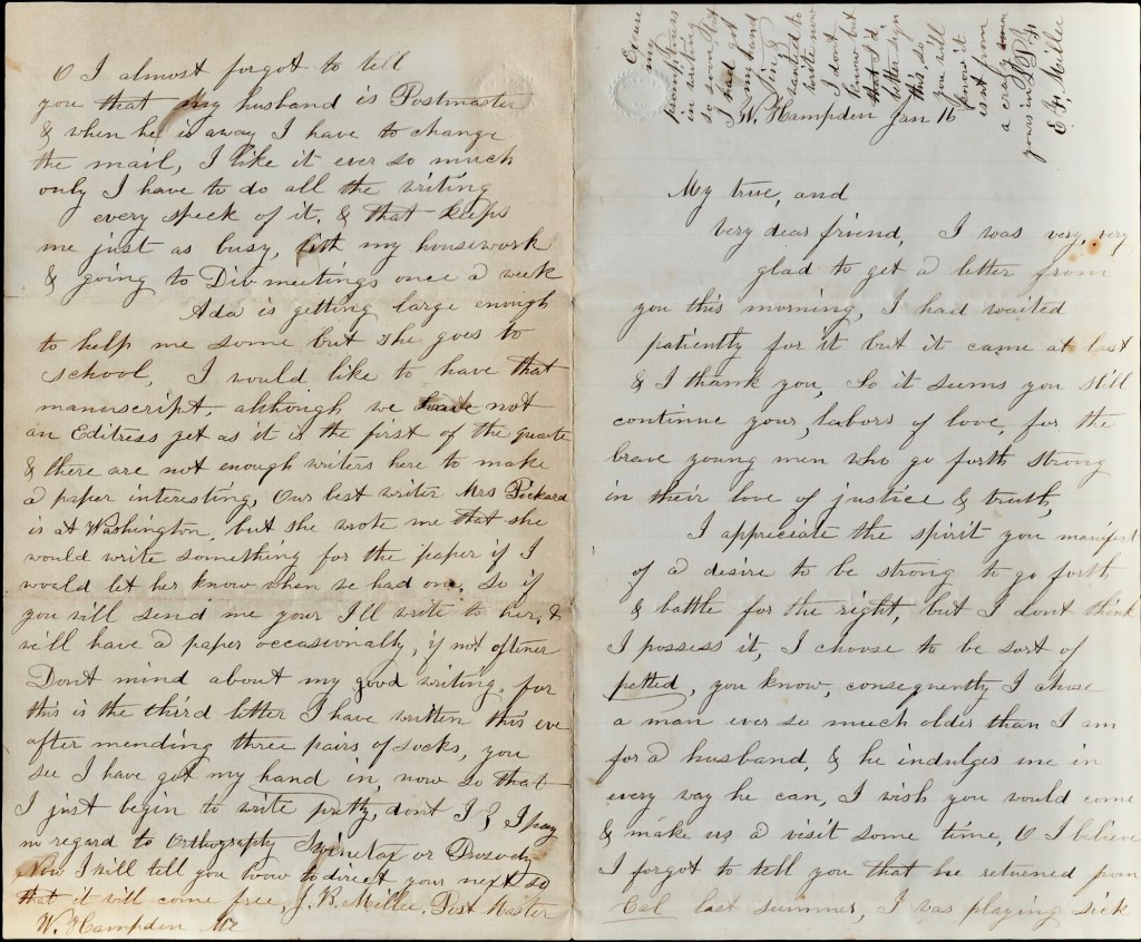 Ada is getting large enough to help me some but she goes to school. I would like to have that manuscript, although we have not an editress yet as it is the first of the quarter & there are not enough writers here to make a paper interesting. Our best writer—Mrs. Packard—is at Washington, but she wrote me that she would write something for the paper if I would let her know when we had one. So if you will send me yours, I’ll write to her & will have a paper occasionally if not oftener. Don’t mind about my good writing for this is the third letter I have written this evening after mending three pairs of socks. You see I have got my hand in now so that I just begin to write pretty, don’t I, & I pay no regard to Orthography, Syntax, or Prosody. Now I will let you how to direct your next so that it will come free; J. B. Miller, Post Master, W. Hampden, Me.