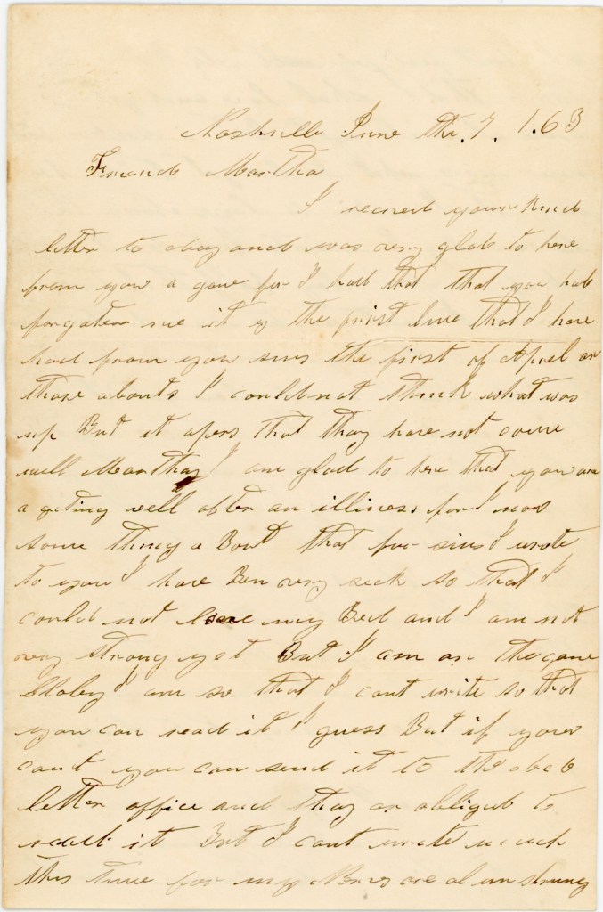 Well, Martha, I am glad to hear that you are a getting well after an illness for I know something about that, for since I wrote to you I have been very sick so that I could not leave my bed and I am not very strong yet. But I am on the gain slowly. I am so that I can’t write so that you can read it, I guess. But if you can’t, you can send it to the dead letter office and they are obliged to read it. But I can’t write much this time for my nerves are all unstrung. I don’t feel my self but I think that I shall live and get home alright yet. But a soldier don’t never know what he has got to know. He may think when he lays down that he can lay five minutes but he ain’t disappointed if he about lay half that time.