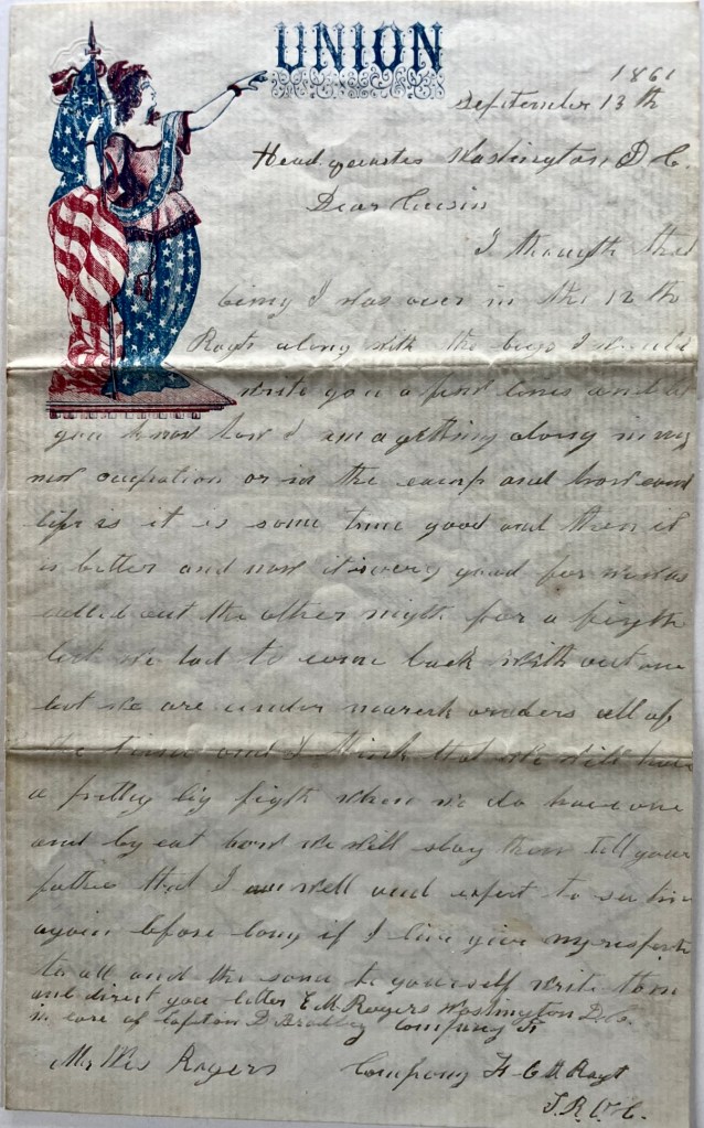 I thought that being [as] I was over in the 12th Regt. along with the boys, I would write you a few lines and let you know how I am getting along in my new occupation, or in the camp and brass wood [?] life. It is sometimes good and then it is better and now it is very good for we was called out the other night for a fight, but we had to come back without one. But we are under marching orders all of the time and I think that we will have a pretty big fight when we do have one, and by [ ] we will stay there. Tell your father that I am well and expect to see him again before long if I live. Give my respects to all and the same to yourself. Write to me and direct your letter—E. M. Rogers, Washington D. C., in care of Captain D. Bradley, Company F.