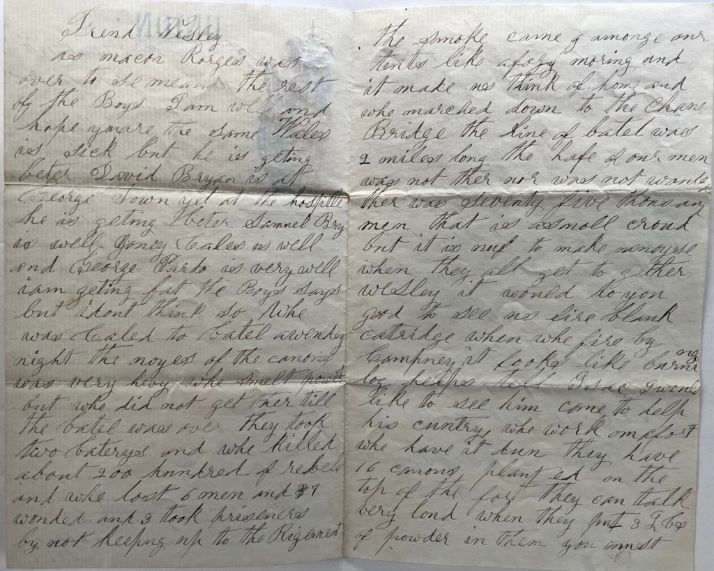 Wesley, it would do you good to see us fire blank cartridges when we fire by company. It looks like burning log [ ]. Tell Isaac I would like to see him come to help his country, who work on a fort. We have it done. They have 16 cannons planted on top of the fort. They can talk very loud when they put 3 lbs. of powder in them.