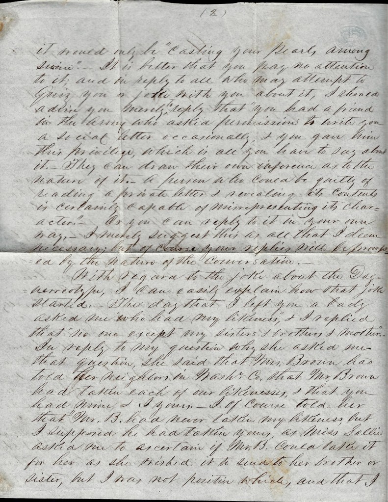 With regard to the joke about the daguerreotype, I can easily explain how that joke started. The day that I left you, a lady asked me “who had my likeness,” & I replied that no one except my sisters & brothers & mother. In reply to my question why she asked me that question, she said that Mrs. Brown had told her neighbors in Washington county that Mr. Brown had taken each of our likenesses & that you had mine, & I yours. I of course told her that “Mrs. Brown had never taken my likeness, but I supposed he had taken yours, as Miss Sallie asked me to ascertain if Mr. Brown could take it for her as she wished it to send to her brother or sister, but I was not positive which, and that I heard you afterward speak of it as having been badly taken on account of some defect in the chemicals.” I let the subject drop, after laughing at the absurd reports people would start, not even mentioning that I wait with you to get it taken. The best way is to let them talk on—it cannot hurt you, if you deem me worthy of your esteem, & are not ashamed to have me known as your affianced. I should like to know which of the Fullerton’s told about the likeness. They both love to talk, & say a great many things merely for the sake of talking. But enough of this. I have devoted already more space to it than you will consider it deserves—at least I hope so.