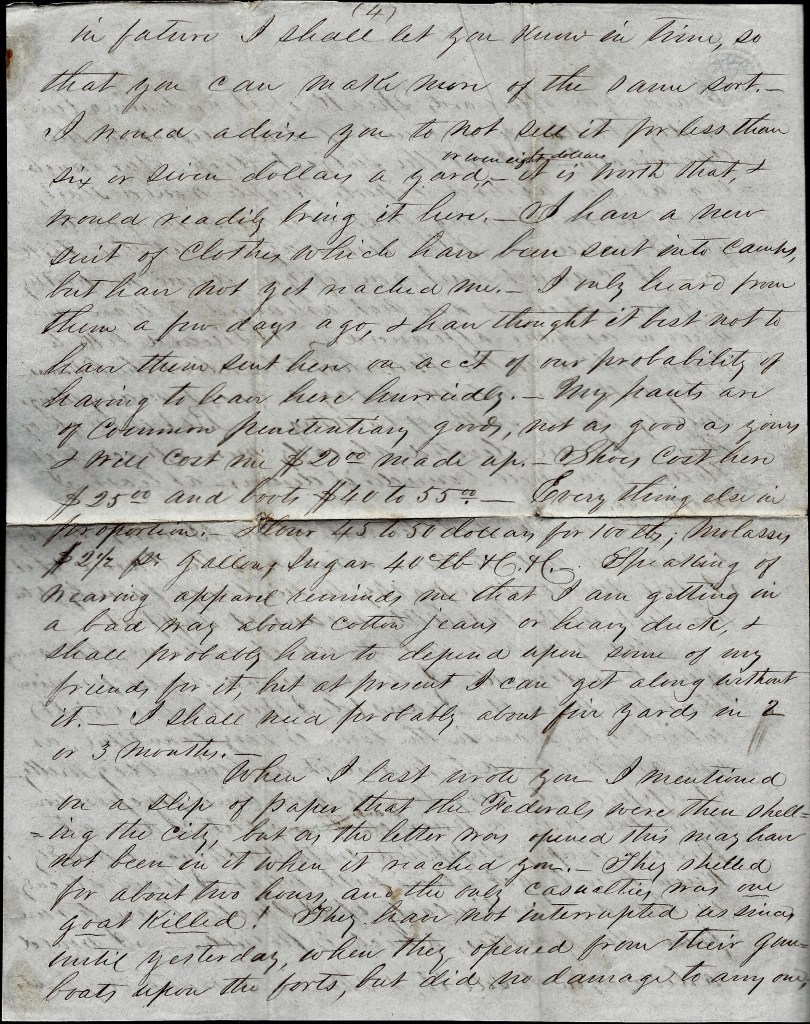 As you are not much of a hand at praising your handiwork, I have formed an impression that the piece of Jeans (do I spell this word right) which you have in the loom is very beautiful, as you are inclined to praise it as being very pretty. I appreciate very highly your kind proposition to me me have a pair of pants; but I am at present amply supplied with clothing & hardly know how to get along with what I have already on hand—particularly if I should have to run from the Yankees which is possible. I would advise you to sell it & should I want any pants in future, I shall let you know in time, so that you can make more of the same sort. I should advise you to not sell it for less than six or seven dollars a yard—or even eight dollars. It is worth that & would readily bring it here. I have a new suit of clothes which have been sent into camp but has not yet reached me. I only heard from them a few days ago & have thought it best not to have them sent here on account of our probability of having to leave here hurriedly. My pants are of common penitentiary goods, not as good as yours, & will cost me $20 made up. Shoes cost here $25 and boots $40 to 55. Everything else in proportion. Flour 45 to 50 dollars for 100 lbs., molasses $2.5 per gallon, sugar 40 cents a lb., &c. &c. Speaking of wearing apparel reminds me that I am getting in a bad way about cotton jeans or heavy duck, & shall probably have to depend upon some of my friends for it, but at present I can get along without it. I shall need probably above five yards in two or three months,