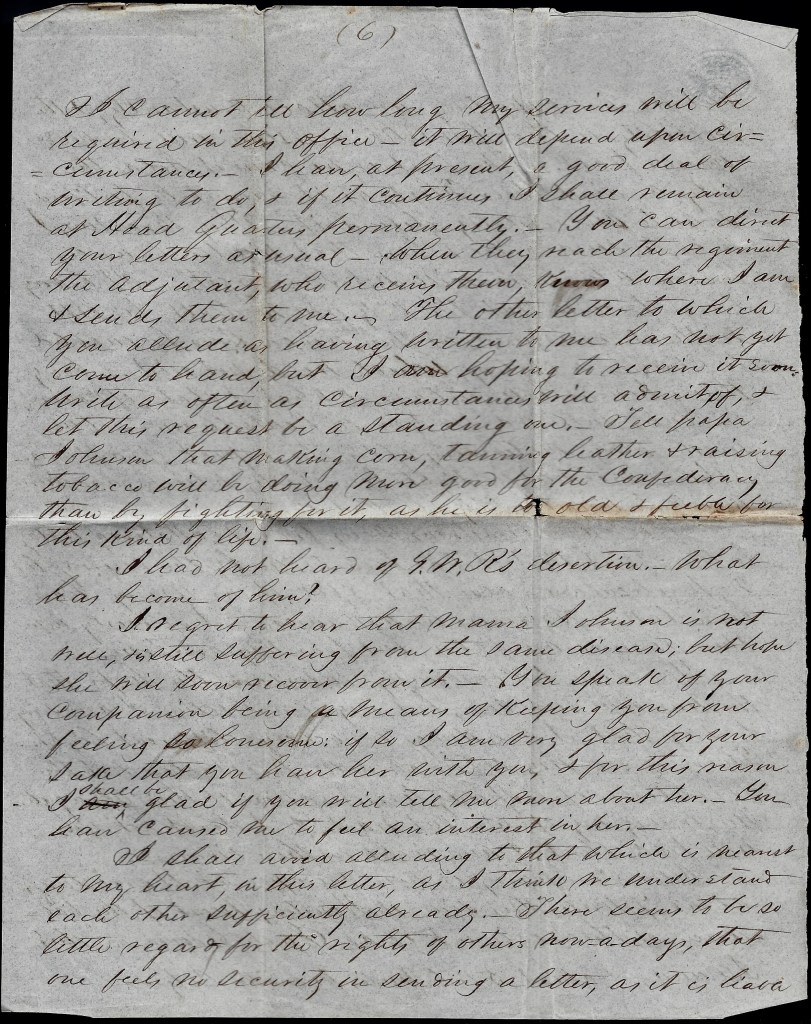 Our company is now camped at Harrisburg, about 7 miles this side of Houston; most of the balance of the regiment is at Eagle Grove on this Island, & about 5 or 6 miles from the city. I cannot tell how long my services will be required in this office. It will depend upon circumstances. I have at present a good deal of writing to do, & if it continues, I shall remain at Head Quarters permanently. You can direct your letters as usual. When they reach the regiment, the adjutant, who receives them, knows where I am and sends them to me. The other letter to which you allude as having written to me has not yet come to hand but I am hoping to receive it soon. Write as often as circumstances admit of & let this request be a standing one. Tell papa Johnson that making corn, tanning leather, & raising tobacco will be doing more good for the Confederacy than by fighting for it, as he is too old and feeble for this kind of life.