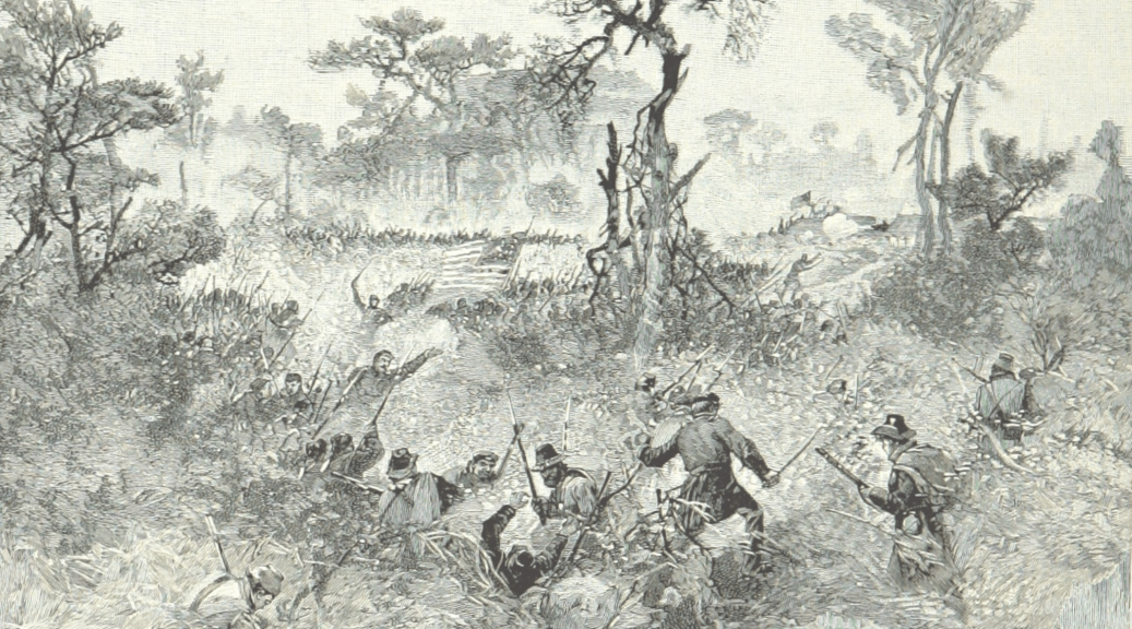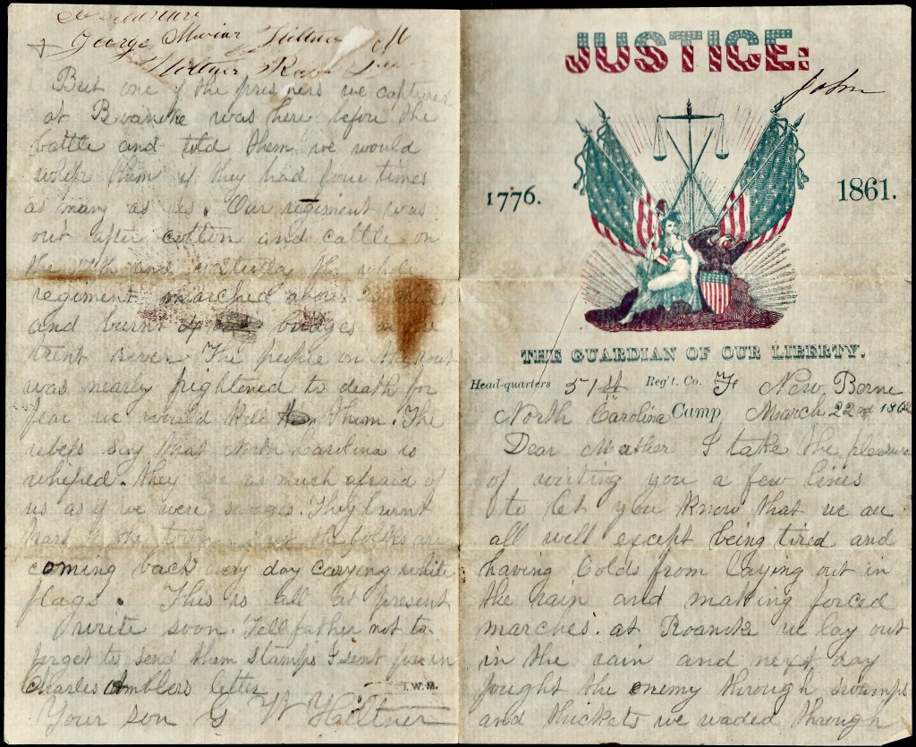 I take the pleasure of writing you a few lines to let you know that we are all well except being tired and having colds from laying out in the rain and making forced marches. At Roanoke we lay out in the rain and next day fought the enemy through swamps and thickets. We waded through water waist deep but that was not a circumstance to the Battle of New Bern. When we commenced to land at New Bern, it was raining and rained until the next day & after the battle. We landed before noon about 12 miles from the town and then commenced to march through the swamp and our regiment had to pull a marine battery. We marched all day and the next night and commenced the fight about 7 o’clock and fought until nearly noon when we made a grand charge and drove them out of their batteries at the point of the bayonet.
