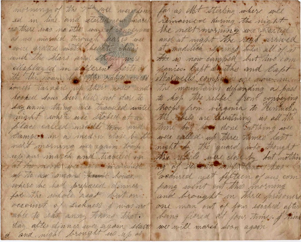 The next morning we again took up out march and traveled on. At noon we were marched up to a man’s house where he had prepared dinner for the whole regiment but on account of sickness, I was not able to eat anything that day, After dinner we again started and night brought us up as far as Mt. Sterling where we remained during the night. The next morning we started and at night the regiment arrived at Mud Lick Springs where all of it is now camped but two companies. Capt. Smith’s and Capt. Maxwell’s companies are now in the mountains defending a pass to keep the Rebels from conveying troops from Virginia to Kentucky. The Rebels are threatening us all the time but have done nothing. We were called up three times last night by the guard who thought the Rebels were close by but nothing of serious importance has occurred yet.