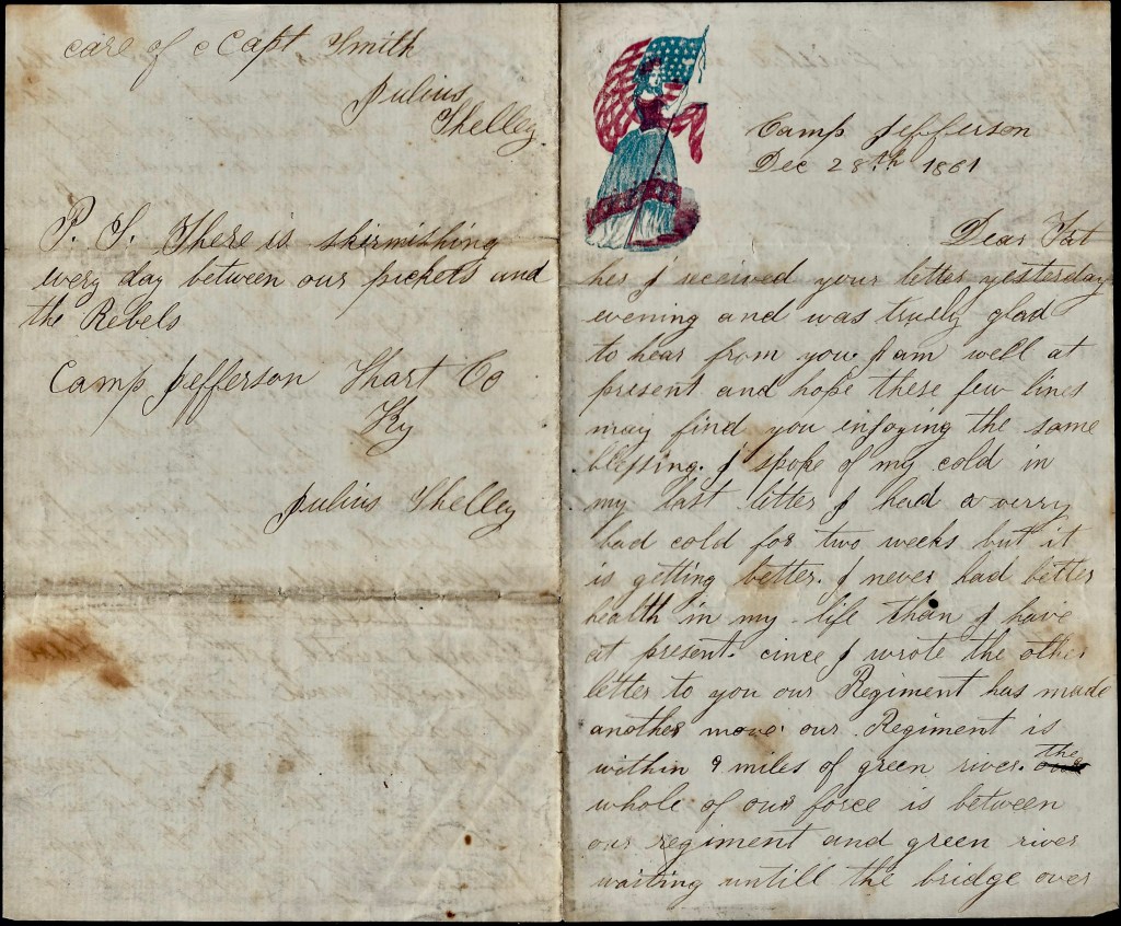 I will send in this letter the two dollars which you sent me and a dollar to buy postage stamps with. Get me a dollar’s worth and send them at your earliest convenience as I am entirely out. I must bring my letter to a close. Write and direct your letter to Camp Jefferson, Kentucky, 2nd Ohio Regiment, in care of Capt. [William A.] Smith. — Julius Shelley