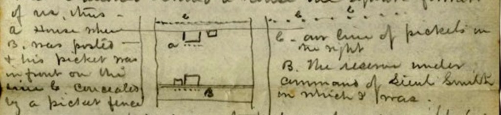 “Sabbath morning, Nov. 23—Four miles from Fredericksburg. As I did not get my letter sent when I commenced it, I thought I would write some more and let you know something about our travels since we crossed the Potomac. We have marched about one hundred and seventy-five miles and we are not at Richmond yet. It is getting some cold and disagreeable but I have not suffered any with cold yet. I have all the clothes I can carry on the march and I hear nothing about winter quarters yet. We have eaten our last cracker this morning and we do not know when we will get any more but we have never starved yet and I think we will get bread before very long. I am very glad that you do not know how we get along here in the army but then it might be worse.
