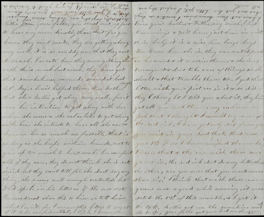I have received two letters from you since I last wrote though it has not been quite a week—one last Friday and one yesterday. I am still at your Father’s but will return home soon. We have been having rainy weather. It rained all yesterday afternoon. Mollie & I went after the mail & it rained nearly all the time we was gone but I got a letter from you & so felt quite well paid for getting a little wet. Mollie received two from Whit last week. Your folks got one from you. They have received two since you left which is all you said you had written. Mollie wrote that letter for your folks. You must not expect to hear any more directly than that for you know they can’t write. They are getting along very well. It is so muddy now that they can’t do much. I wrote how they were getting along with their work last week; they have got that smokehouse moved. Moved it last Saturday. Major Lewis helped them. Your Mother says that she & Mollie get along very well for it was her intention to get along with her when she came & she calculated to get along with her. She intends to bear all she can & humor her as much as possible—that is, as long as she keeps within bounds, not to give up to much to her, and make her comfortable if they can. They do not think she is satisfied but they can’t tell for she don’t say anything. She seems well enough contented but Whit spoke in his letter as if she was not. You need not show this to him or tell him what I write for I mean this letter to most of it to be confidential. I think I know she tries your Mother & Father very much…