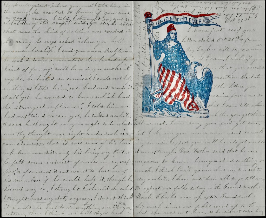 Our preacher, Rev. Elliot, stayed with us last Sabbath night. He did not discover I was married till morn. Then he said, “good morning, sister Trickle!” when I came out of the room. There was someone else in the dining room so I took the liberty to tell him my name was not Trickle but Mathews. He wanted to know how that happened, it was Trickle on the class book. I told him I was married a short time ago & presumed it had not been changed yet & so they they will get married & be given in marriage says he. I said I supposed so & so it would be as long as the world lasted he said. He then inquired “where you was.” I told him in the army. He wanted to know if you was a good man. I told I thought so. Was you a “Soldier of the Cross?” I said yes sir. He said that was the “kind of soldiers was needed in the army.” He next asked “Where you held your membership.” I said you was a Presbyterian. He looked down a minute & then looked up kind of funny. “Well how do you make it?” says he. He looked so comical I could not help smiling as I told him, “We had not made it at all yet.” He wanted to know which had the “strongest influence.” I told him we had not tried to see yet. He talked a while & said he thought everyone ought to so whatever they thought was right under such circumstances & that it was none of his business how we did—only his being my pastor, he felt some interest of course in my welfare and of course did not want to lose one of his members if he could help it though he did not say so. I thought I should do what I thought was my duty anyhow. I do not think it would be best to do anything until you return. Then I think we will try our luck membership in the same church. I, like Mr. E, like to see families united as much as possible on this subject.