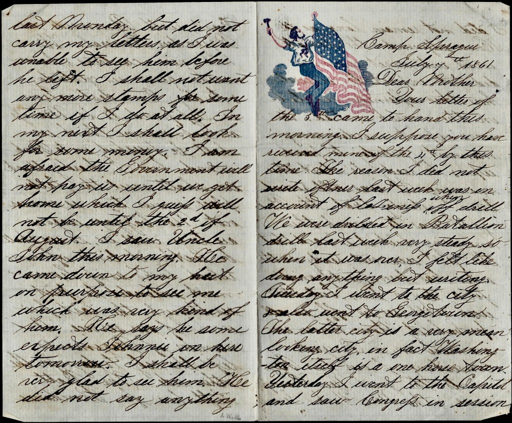 Tuesday [July 2nd] I went to the city and also went to Georgetown. The latter city is a very mean looking city. In fact, Washington itself is a one horse town. Yesterday I went to the Capitol and saw Congress in session. I did not remain long as the House adjourned & the Senate went into secret session.