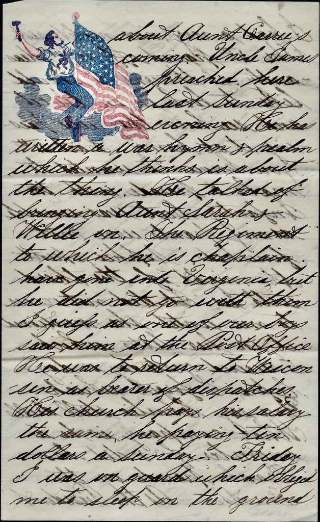 Uncle James [Cook Richmond] preached here last Sunday evening. He has written a war hymn & psalm which he thinks is about the thing. He talked of bringing Aunt Sarah & Willie on. The regiment to which he is chaplain have gone into Virginia, but he did not go with them, I guess, as one of our boys saw him at the Post Office. He was to return to Wisconsin as bearer of dispatches. His church pays his salary the same, he paying ten dollars a Sunday. 3