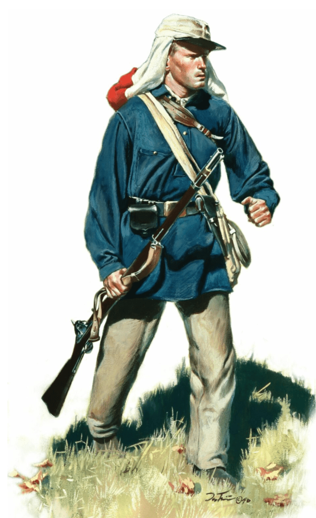 A painting by Don Troiani of the uniform worn by the 1st Rhode Island Detached Militia at Bull Run—the blue “Burnside blouse,” the grey pants, a red blanket roll on the back, and a kepi with a havelock to keep the sun off the neck.
