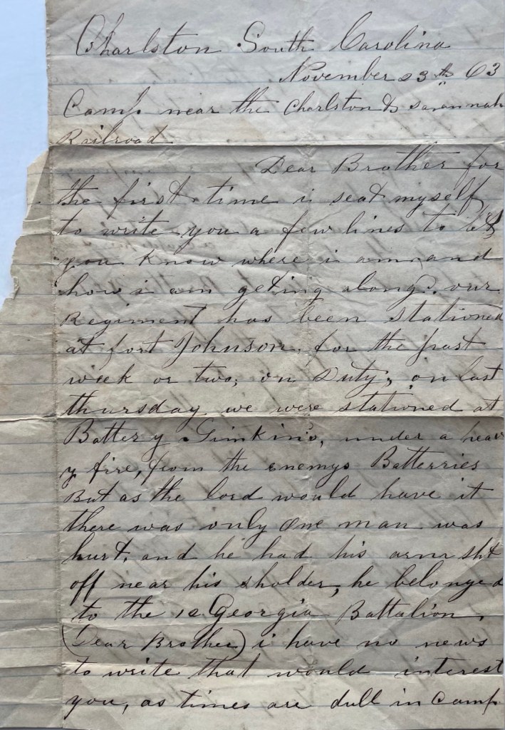 For the first time I seat myself to write you a few lines to let you know where I am and how I am getting along. Our regiment has been stationed at Fort Johnson for the past week or two on duty. On last Thursday we were stationed at Battery Simpkins under a heavy fire from the enemy’s batteries. But as the Lord would have it, there was only one man was hurt and he had his arm shot off near his shoulder. He belonged to the 12th Georgia Battalion.