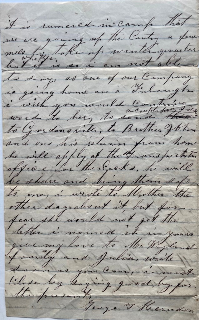 Give my love to Mr. Wayland’s family and Julia. Write soon as you can. I must close by saying goodbye for the present. — George T. Herndon