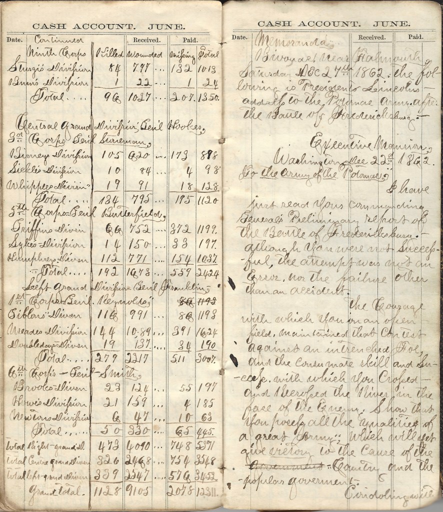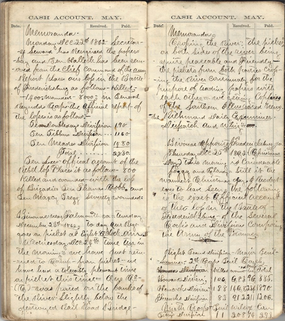 Bivouac opposite Fredericksburg, Va., Thursday, Dec. 25th 1862 (Christmas Day)—This mornin is considerable foggy and cloudy. Still is the warmest Christmas Day I have seen. The following is the exact official account of the loss in the Battle of Fredericksburg. Of the several Corps & Divisions composing the Army of the Potomac: