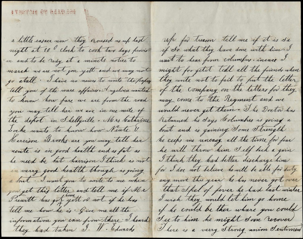 I heard they had taken J. W. Edwards up for treason. Tell me if it is so. If so, what they have done with him. I wait to hear from Columbus. In case I might forget, tell all the friends when they write, not to fail to put the letter of the company on the letters for they may come to the regiment and we would never get them.