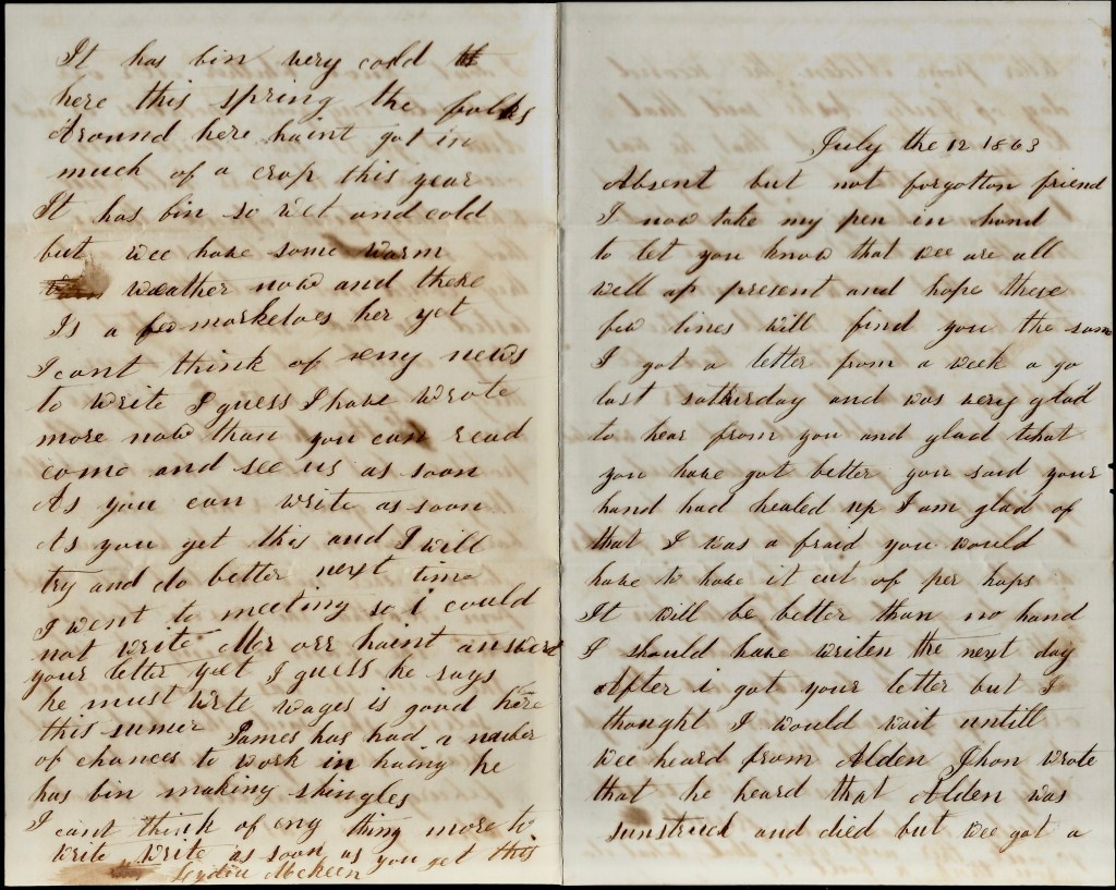 I can’t think of any news to write. I guess I have wrote more now than you can read. Come and see us as soon as you can. Write as soon as you get this and I will try and do better next time. I went to meeting so I could not write. Mr. Orr haint answered your letter yet, I guess. He says he must write. Wages is good here this summer. James has had a number of chances to work in haying. He has been making shingles.