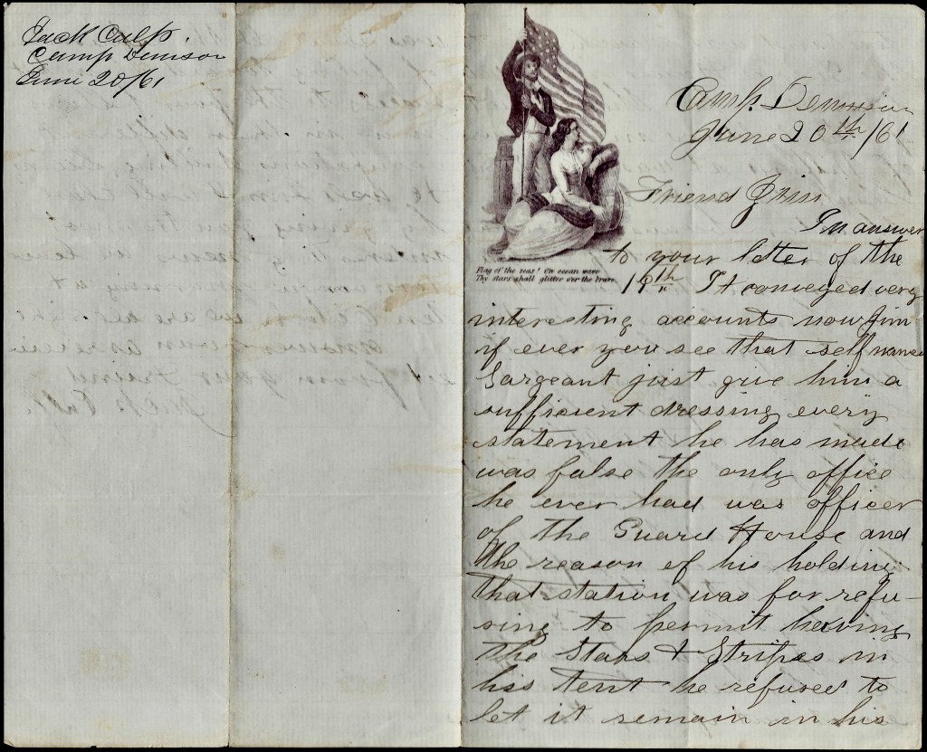 In answer to your letter of the 19th, it conveyed very interesting accounts. Now Jim if ever you see that self named sergeant, just give him a sufficient dressing. Every statement he has made was false. The only office he ever had was Officer of the Guard House and the reason of his holding that station was refusing to permit having the Stars & Stripes in his tent. He refused to let it remain in his tent and was marched into the Guard House immediately. And as for the conduct of the soldiers in the town of Milford, it was all a point blank lie unless he was actor because there has been no conduct of such a nature in this camp to my knowledge. Now Jim, just expose him to all the community and let him be respected likewise.