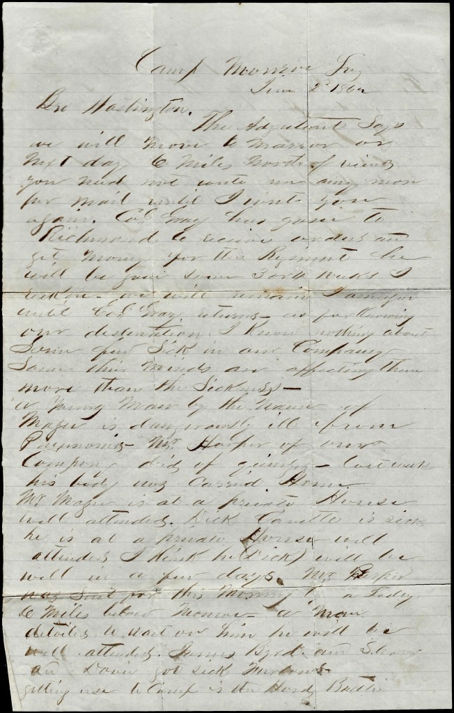 The Adjutant says we will move tomorrow or next day 6 miles north of Vienna. You need not write anymore now per mail until I write you again. Col. Gray has gone to Richmond to receive orders and get money for the regiment. He will be gone some 3 or 4 weeks I reckon. We will remain [ ] until Col. Gray returns. As for knowing our destination, I know nothing about. Some few sick in our company. Some their minds are affecting them more than the sickness. A young man by the name of Mager is dangerously ill from pneumonia. Mr. Harper of our company died of quinsy last week. His body was carried home. Mr. Mager is at a private house well attended. I think he (Dick) will be well in a few days. Mr. Harper was sent for this morning by a lady 6 miles below Monroe. A man detailed to wait on him. He will be well attended. James Byrd and Strong and Davis got sick furloughs. Getting use to camp is the hard [ ].