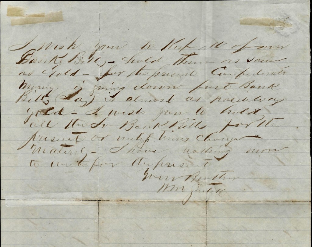I wish you to keep all of our Bank bills. Hold them as same as Gold, for the present Confederate money is going down fast. Bank Bills (La.) is almost as [ ] as gold. I wish you to hold all the La. Bank Bills for the present or unless times change materially. I have nothing more to write for the present. Your brother, — W. M. Sentell
