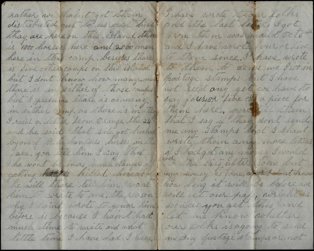 I sit myself down this pleasant Sabbath morning to write a few lines to you to let you know how I am getting along. I am well at present and enjoying myself first rate and I hope this will find you the same. I am getting so fat that I can’t hardly see out of my eyes. I have gained about 25 pounds since I left home and I never enjoyed myself better nor enjoyed better health for the same length of time in my life. I wish you and Sile was here and I know you would enjoy yourselves better than you ever did in Pennsylvania. We have got all of our uniform except overcoats and we are to have them tomorrow. We hain’t got our horses yet or rather we hain’t got them distributed out to us yet but they are here on this island. There is 1,000 horses here and 2,000 men here in this camp besides. There is five other camps on this island but I don’t know how many men there is in either of those camps but I presume there is as many in either camp as there is in this.