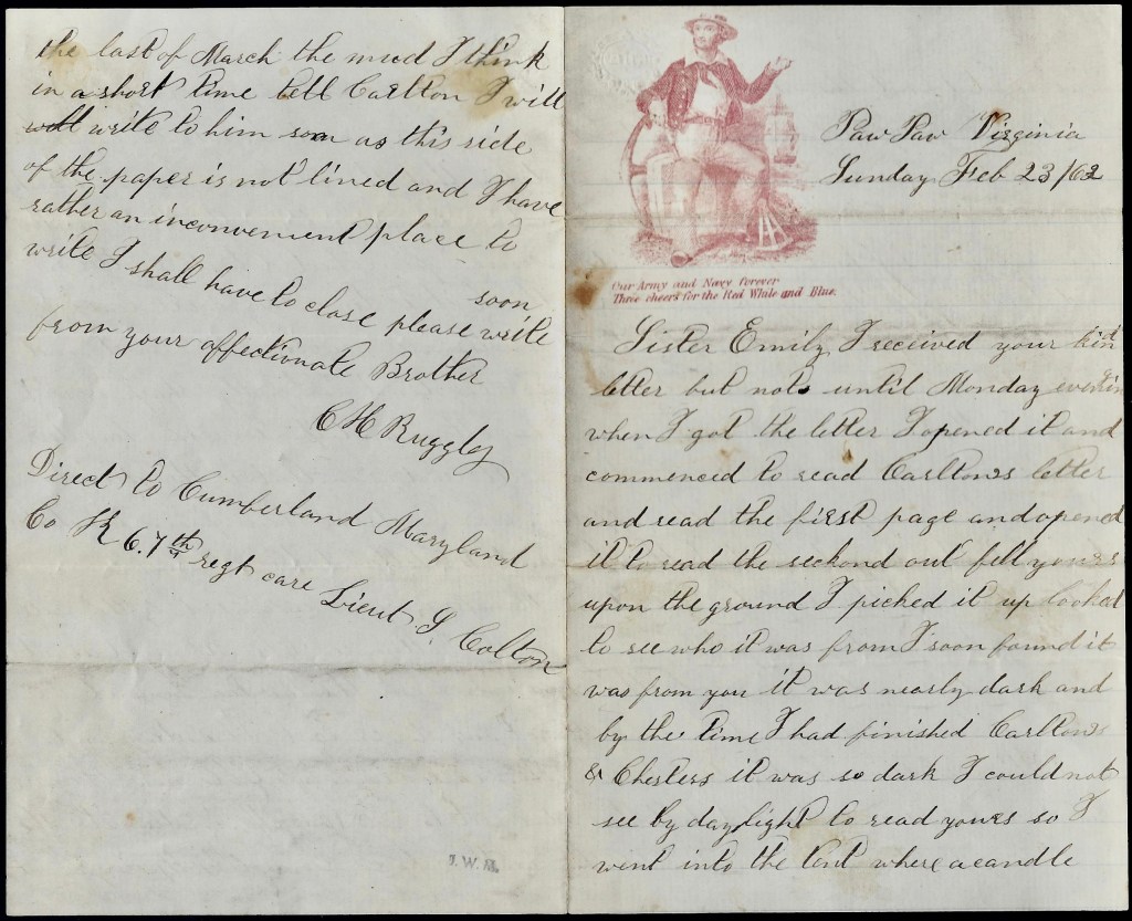 We are encamped by the side of the Baltimore & Ohio Railroad and about 80 rods from the Paw Paw Tunnel. We got our stoves last Thursday and we are very comfortable now. They are two feet long and 10 inches in diameter. The weather here seems like Spring about the last of March. The mud, I think, in a short time [dry up]. Tell Carlton I will write to him soon as this side of the paper is not lined and I have rather an inconvenient place to write. I shall have to close. Please write soon. From your affectionate brother, — C. H. Ruggles