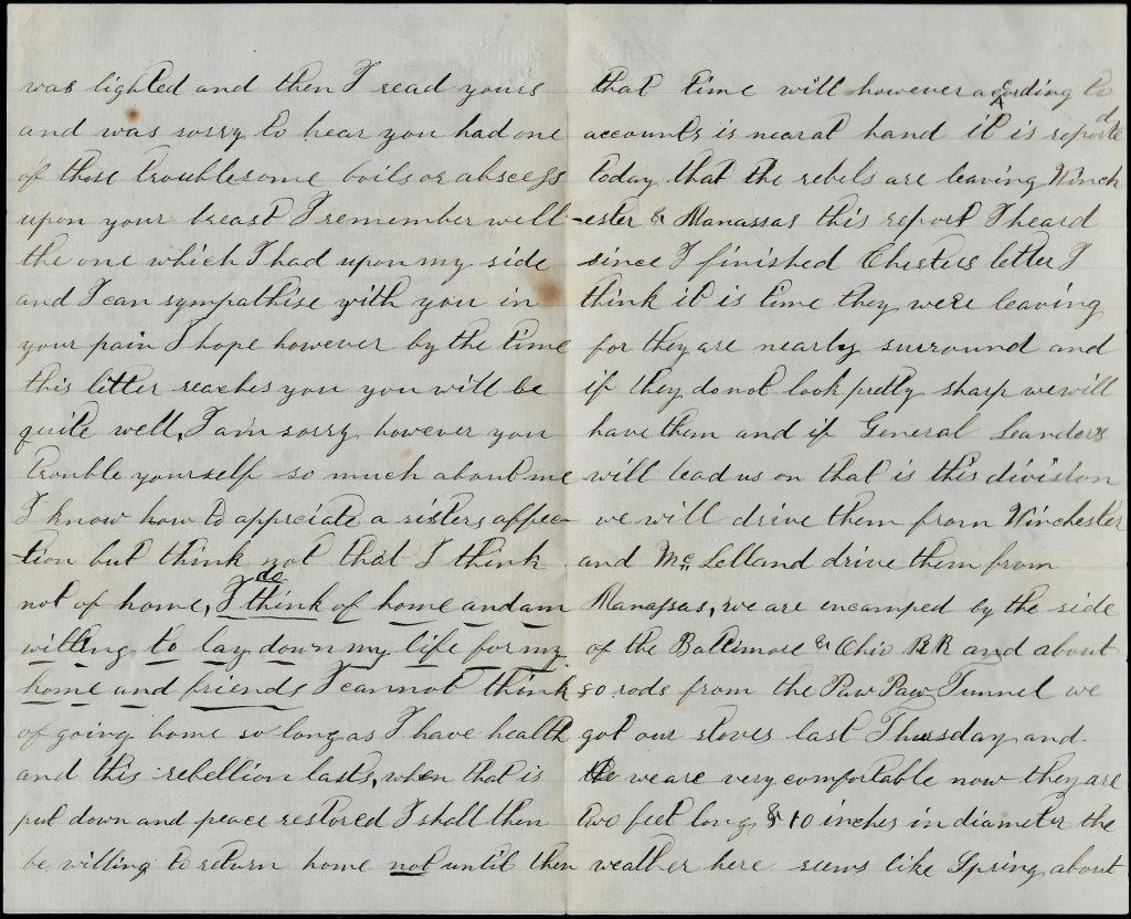 I know how to appreciate sister’s affection but think not that I think not of home. I do think of home and am willing to lay down my life for my home and friends. I cannot think of going home so long as I have health and this rebellion lasts. When that is put down and peace restored, I shall then be willing to return home. Not until then. That time will, however, according to accounts, is near at hand. It is reported today that the rebels are leaving Winchester & Manassas. This report I heard since I finished Chester’s letter. I think it is time they were leaving for they are nearly surrounded and if they don’t look pretty sharp, we will have them. And if General Sanders will lead us on—that is, this division—-we will drive them from Winchester and McClellan drive them from Manassas.